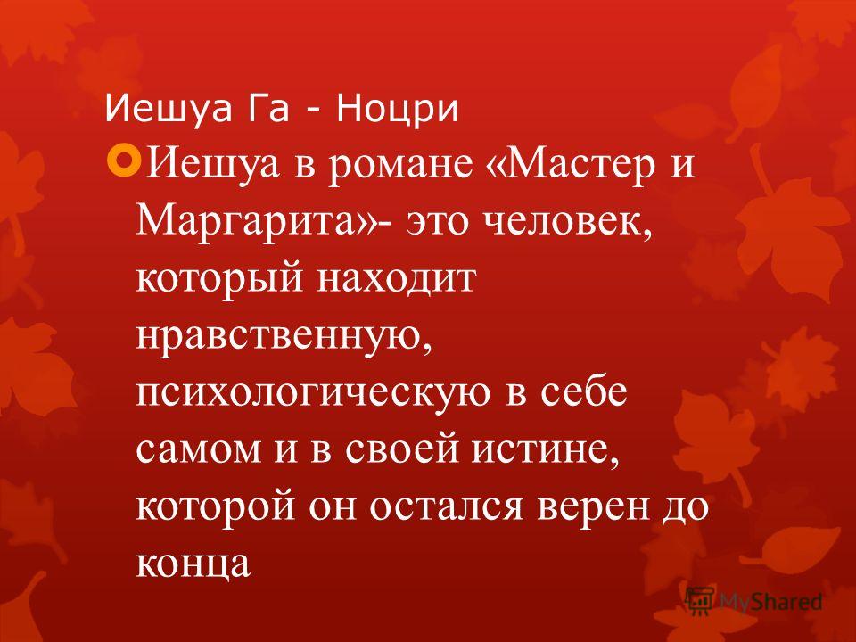 Иешуа Га — Ноцри Иешуа в романе «Мастер и Маргарита»- это человек, который находит нравственную, психологическую в себе самом и в своей истине, которой он остался верен до конца