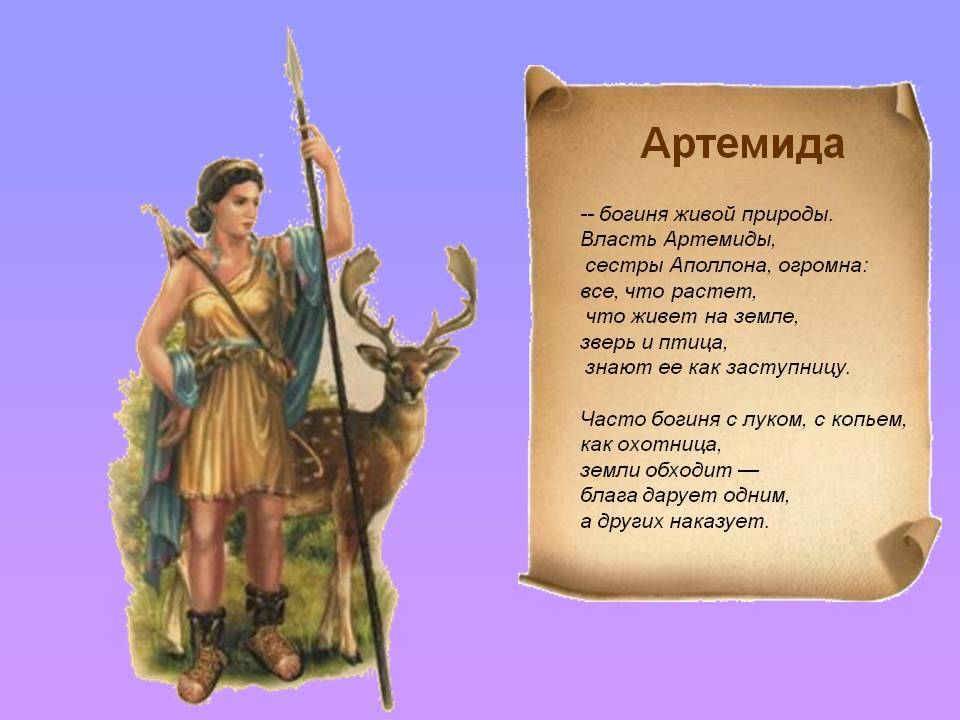 Еще существует много легенд об Артемиде, которая считалась сестрой Аполлона. Артемида — девственная богиня охоты, плодородия и девичьей невинности. Согласно легенде, они вместе с братом убили с помощью стрел всех сыновей Ниобы, которая со временем слишком возгордилась.
