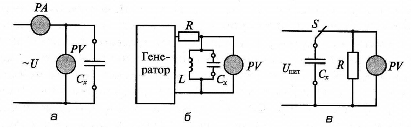 Определение емкости конденсатора или других устройств емкостного характера также может осуществляться различными способами. Простейший из них — метод амперметра-вольтметра (рис. 6, а).