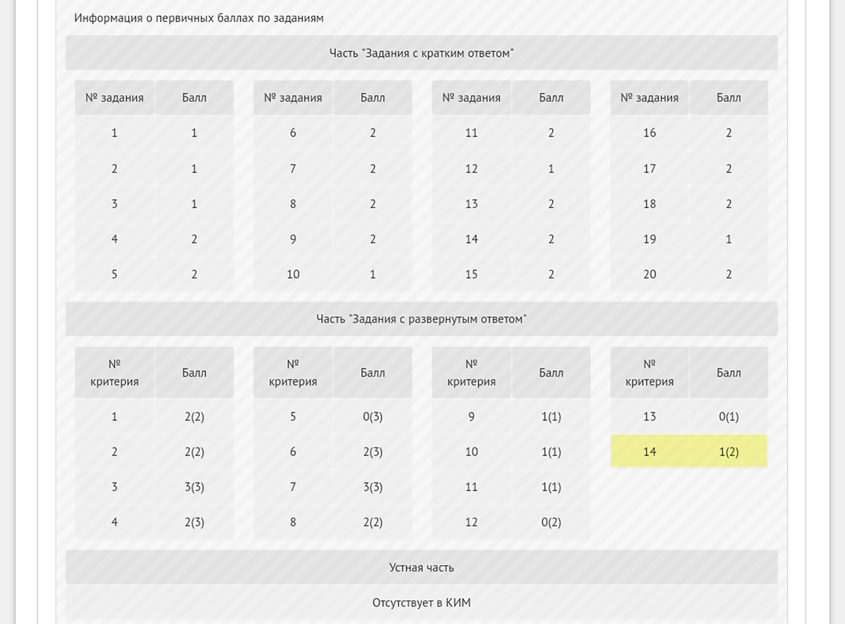 В закладке с первичными баллами можно посмотреть, что и как оценили эксперты. Оценка — это критерий с баллом. Например, по четырнадцатому критерию — качеству приводимых социальных фактов и примеров — мне поставили один балл из двух возможных. Расшифровать критерий можно с помощью демонстрационных вариантов ЕГЭ. За один источник ставят один балл, за два или больше — два балла