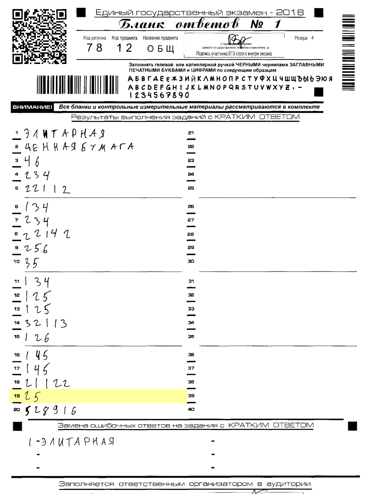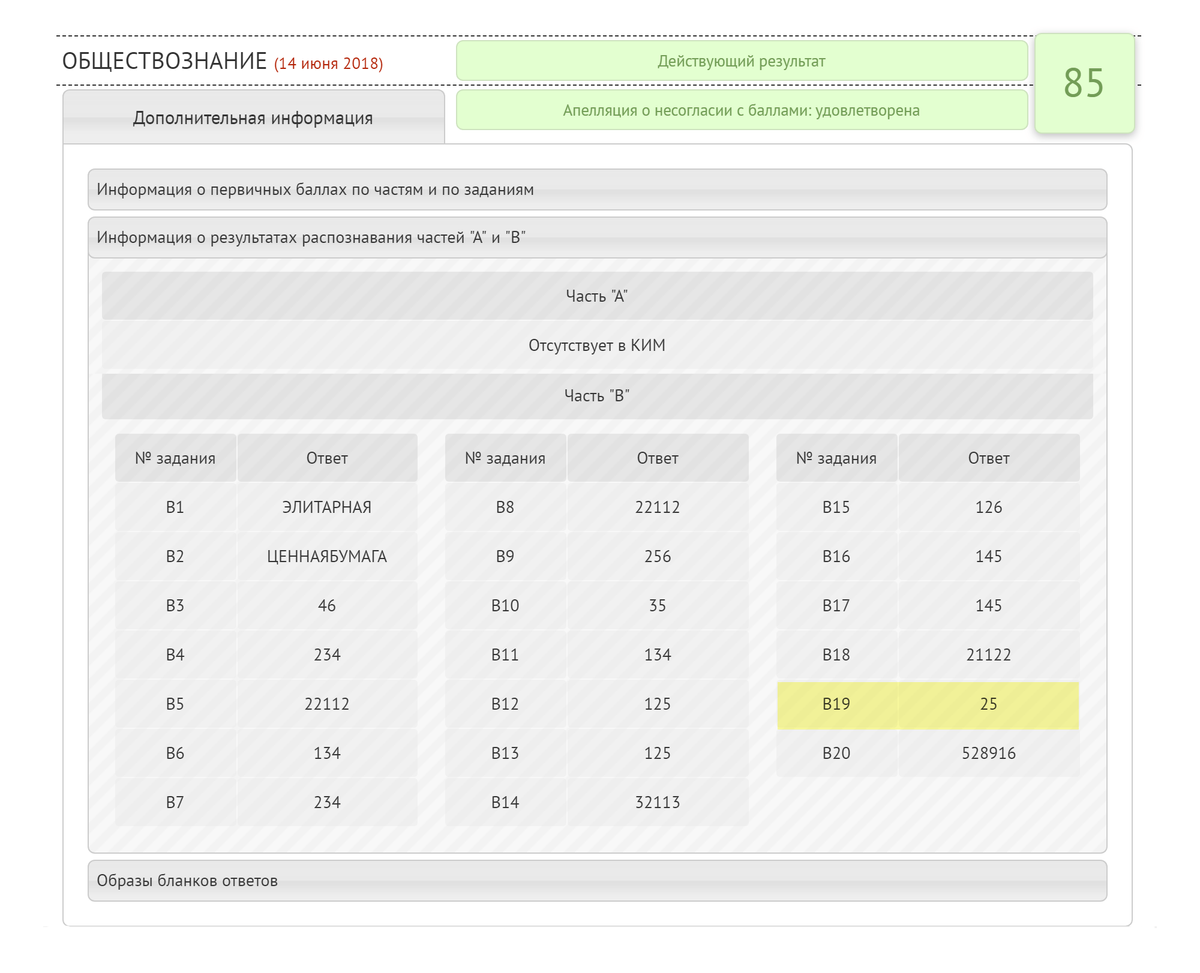 Чтобы проверить, как компьютер распознал ответы, бланк нужно сравнить с результатами распознавания, которые тоже опубликованы на сайте. В моем бланке ответ на 19-й вопрос — «25», но компьютер распознал его как «15». После апелляции результат распознавания исправили