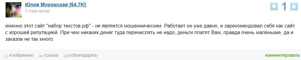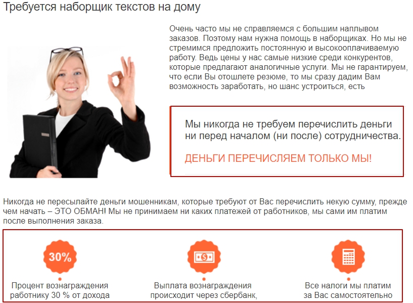 Но будьте внимательны, как вы уже видели в отзывал, мошенники зачастую представляются главным редактором какого-либо журнала или издательской компании. Если вы действительно хотите работать наборщиком текста дома, то имеет смысл обзвонить издательства и предложить свои услуги. Довольно часто с вами будут сотрудничать. Только сразу предупредят о заработной плате — она будет составлять около 10 тысяч рублей за полный рабочий день, а не как в обещаниях мошенников, 30-40 тысяч за пару часов работы в день. Разумеется всякие страховки или вложения не потребуются. Все тексты будут высылаться вам электронно (сканы или фото) или лично передаваться (если работодатель окажется в вашем городе).