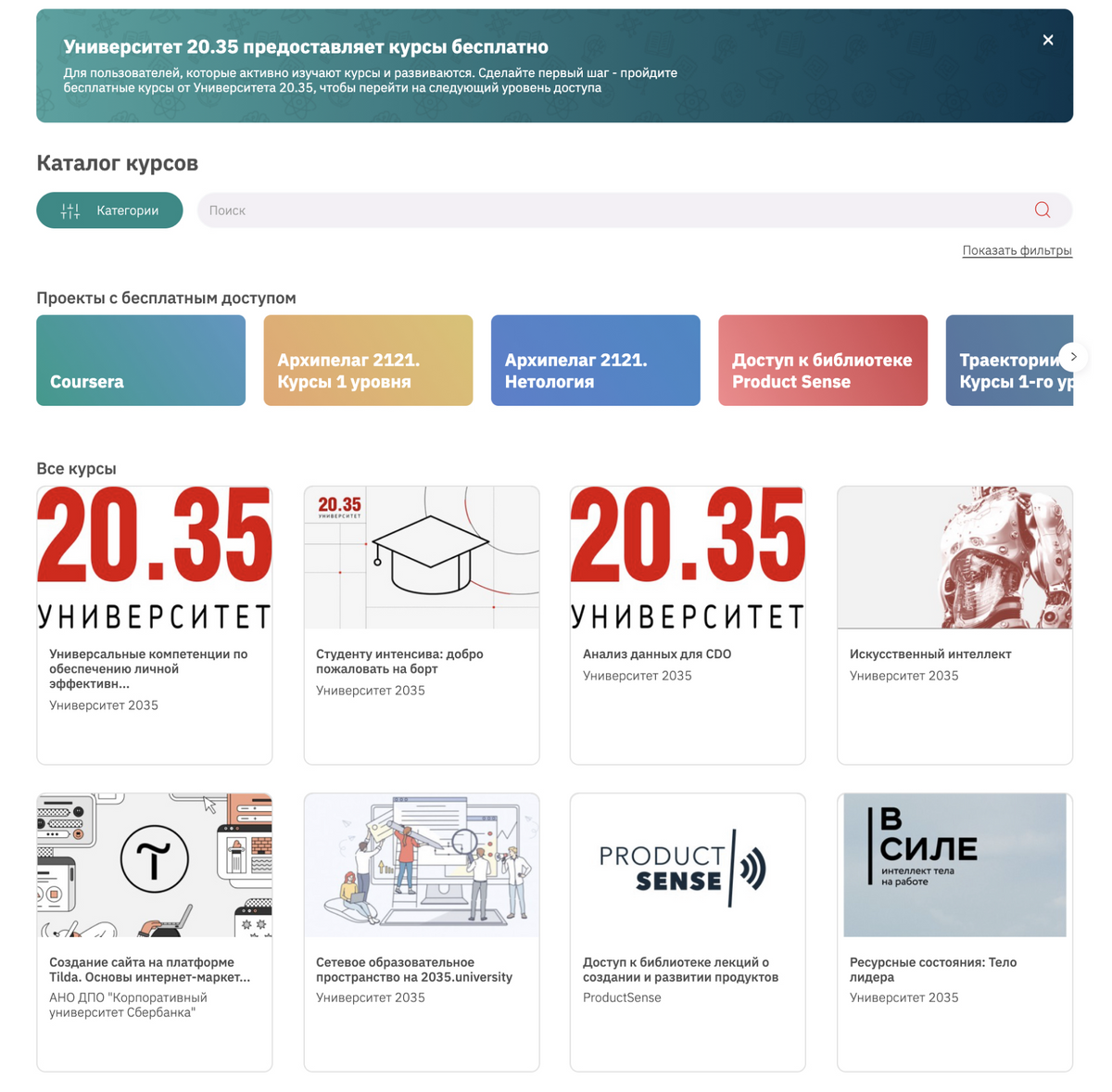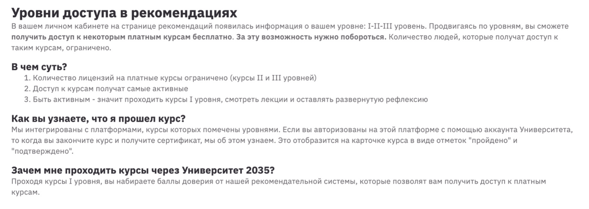 После тестов присваивается первый уровень. Активным слушателям будут открываться второй и третий — они позволяют выбирать курсы из платного каталога