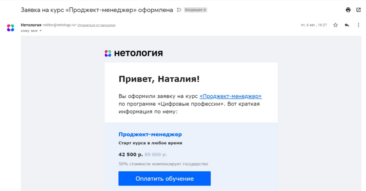На почту придет уведомление, где стоимость курса будет указана со скидкой 50%. Такой же курс на сайте Еще вам позвонит менеджер для подтверждения