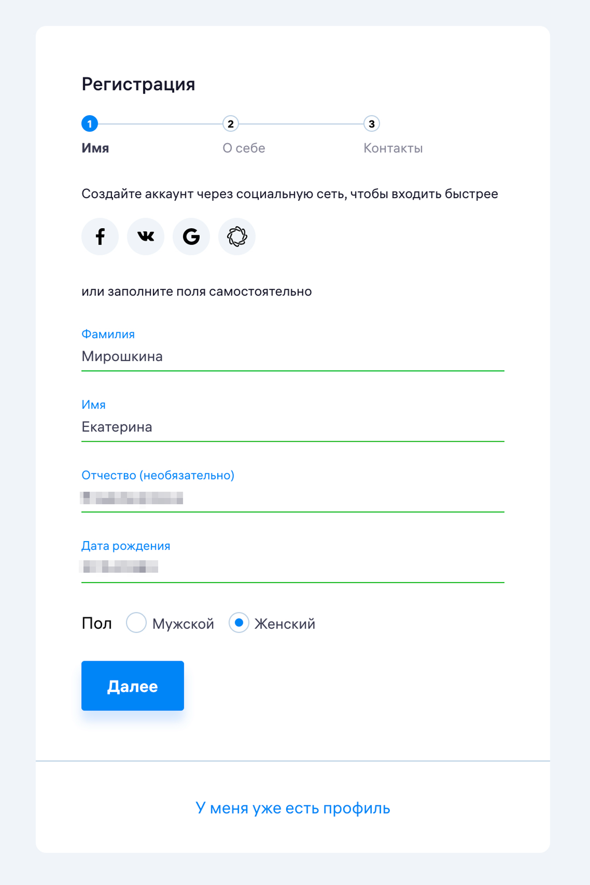 Можно войти через соцсеть или заполнить данные вручную. На создание профиля уйдет не больше пяти минут