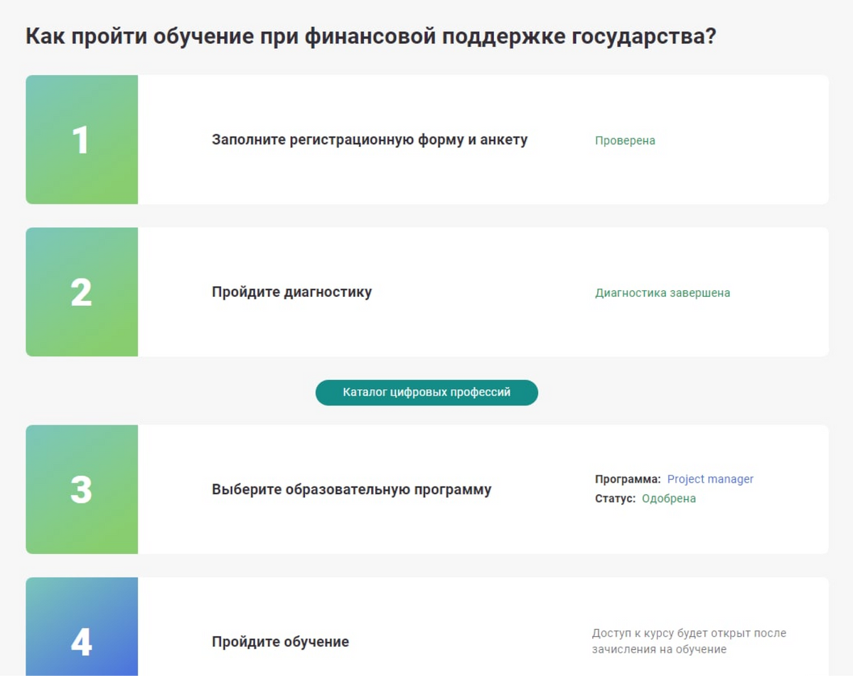 После одобрения вам нужно уплатить свою часть стоимости курса. Затем откроется доступ к курсу. Образовательная организация автоматически получит часть денег из бюджета, а вы сэкономите.