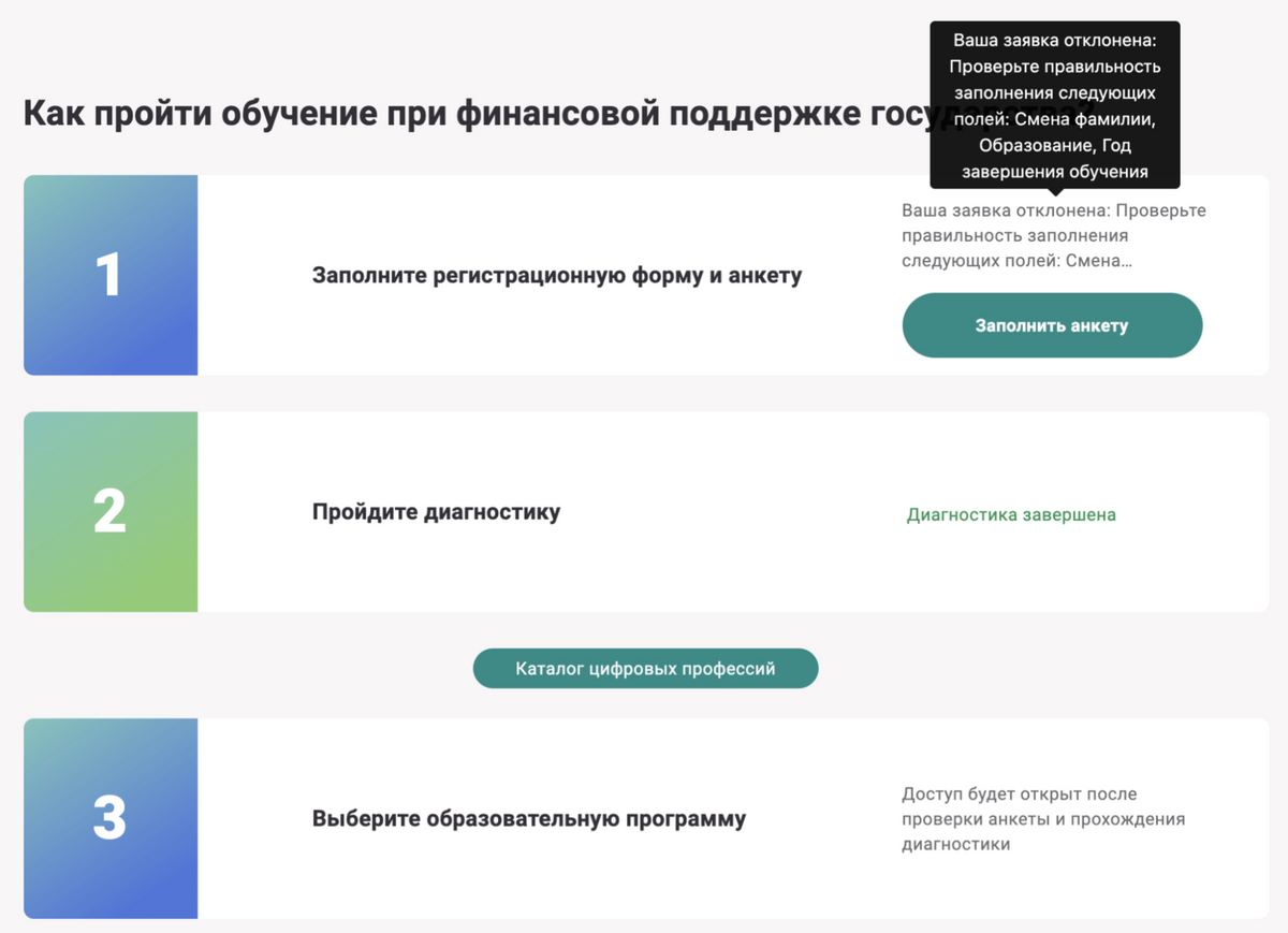 Если заявку одобрили, то в графе для третьего этапа изменится статус и будет указана выбранная программа