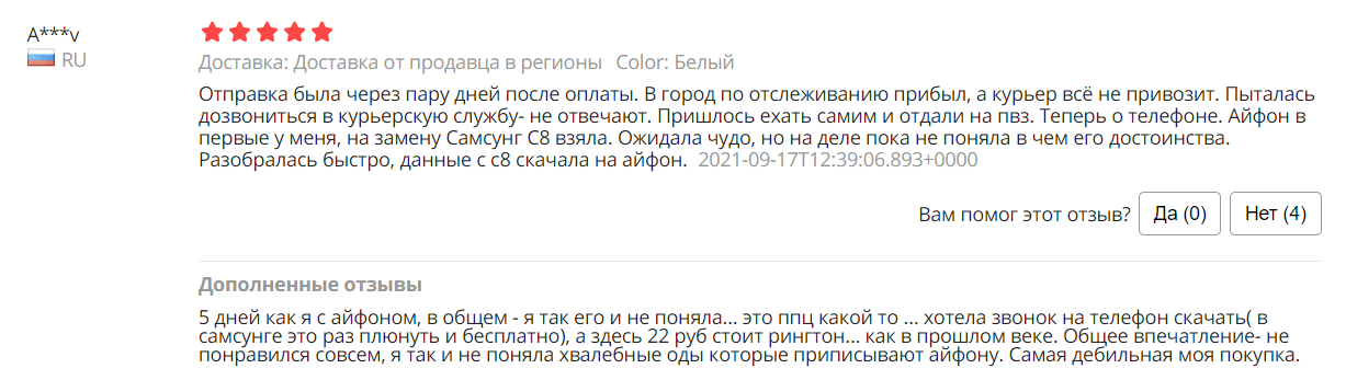 Ниже показан пример отзыва. Девушка купила телефон у продавца «Мегафон» на сайте Aliexpress. Сначала она пишет про то, что курьер не привозит товар, а дальше жалуется на то, что в iPhone все опции платные. В обоих случаях продавец не виноват — но это уже можно расценивать как негативный опыт клиента.