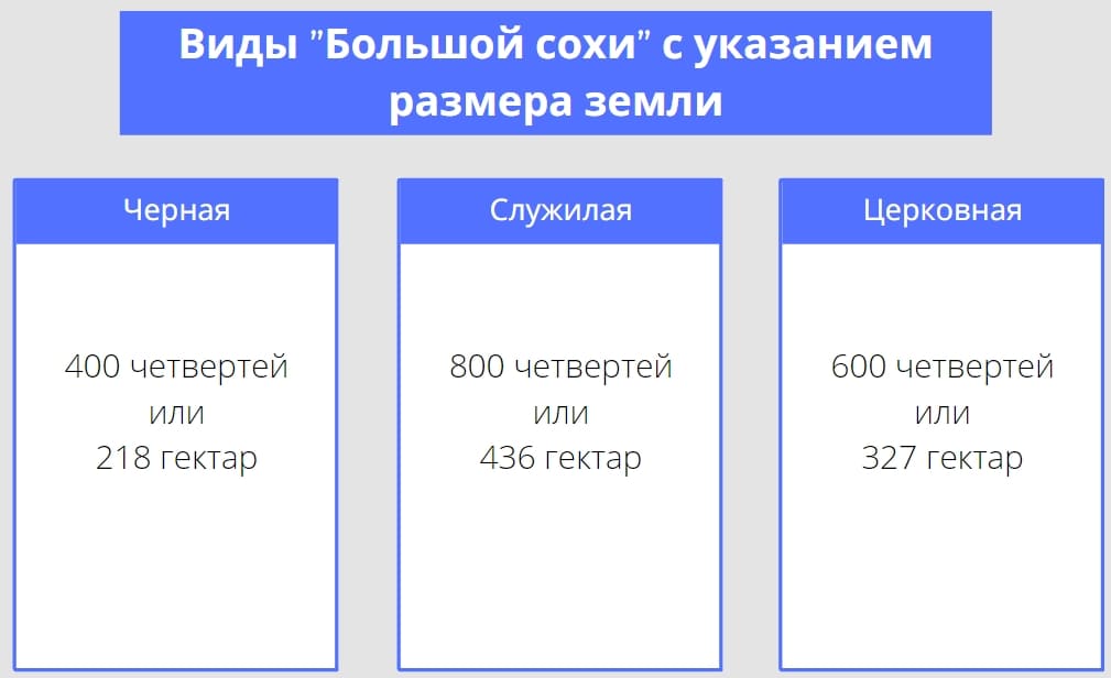 Основной формой налогообложения с середины XVI века становилась «большая соха». Она состояла из разного количества земель. Соха делилась на четверти, которые составляли половину десятины.