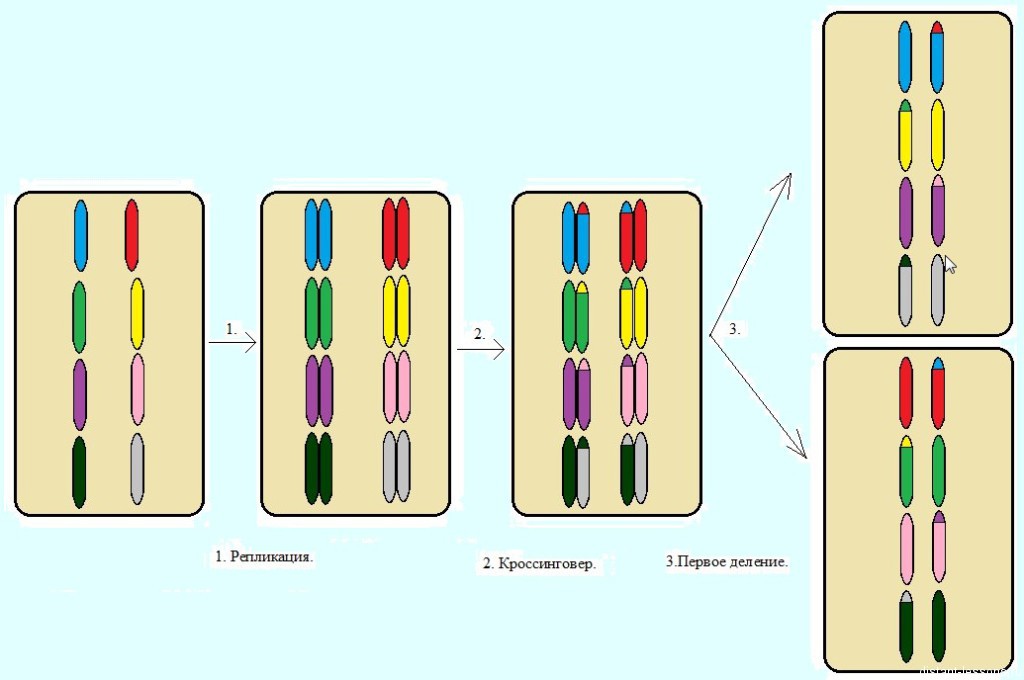 Также как и в митозе в профазе первого деления происходит спирализация хромосом (наследственный материал плотно упаковывается). В то же время происходит сближение парных или гомологичных хромосом. Они притягиваются друг к другу одинаковыми участками, происходит конъюгация (соединение хромосом). В результате получаются пары хромосом, называемые бивалентами, которые состоят из четырех нитей. Когда хромосомы пребывают в таком состоянии, они продолжают скручиваться (продолжают спирализацию), при этом хроматиды перепутываются. Когда гомологичные хромосомы начинают разделяться, они как бы отталкиваются друг от друга. В результате получаются разрывы, которые затем вновь закрываются. Таким образом, хромосомы совершают обмен участками и заодно и наследственной информацией. Перекрест, который сопровождается обменом участками ДНК и получил название кроссинговера.