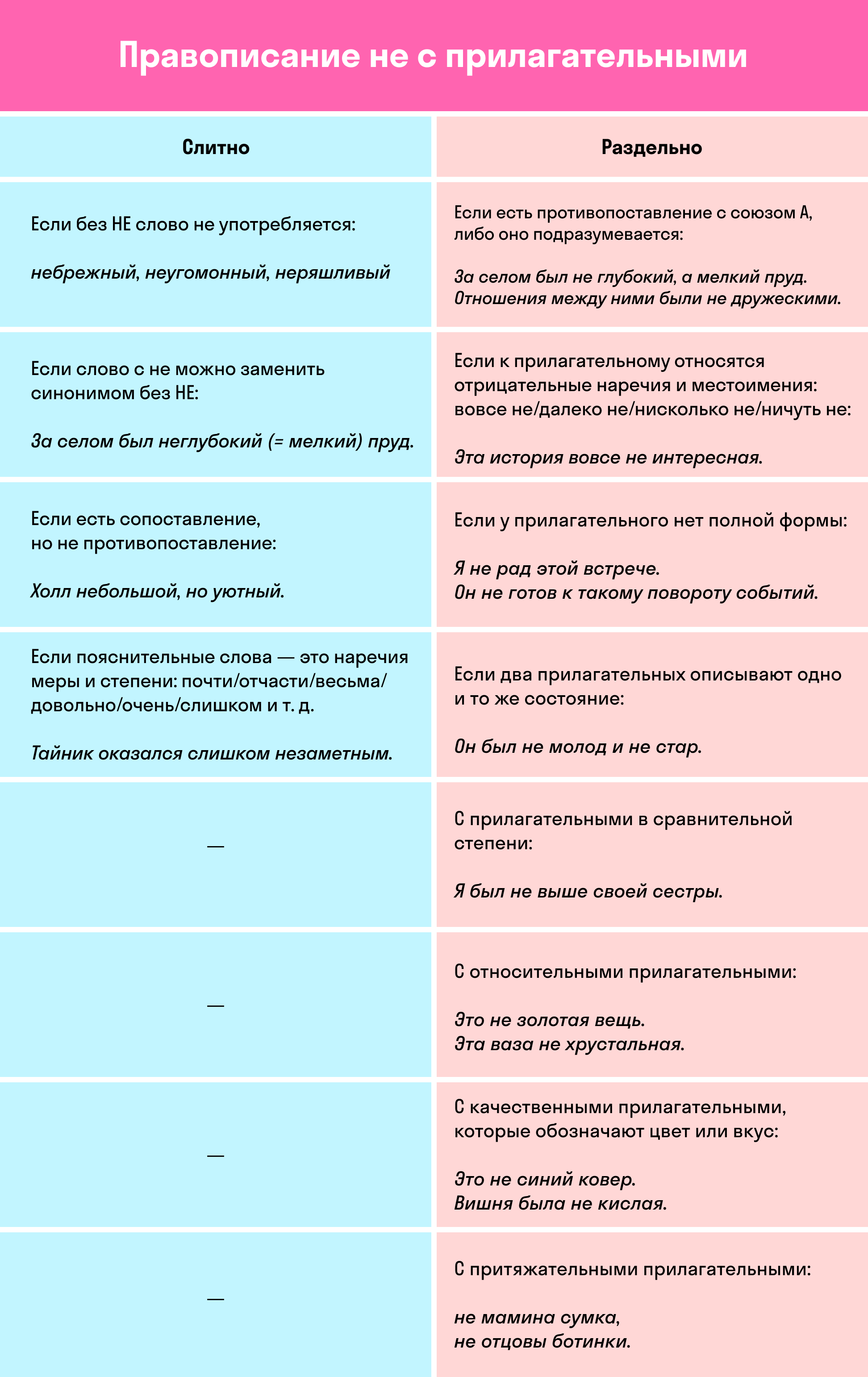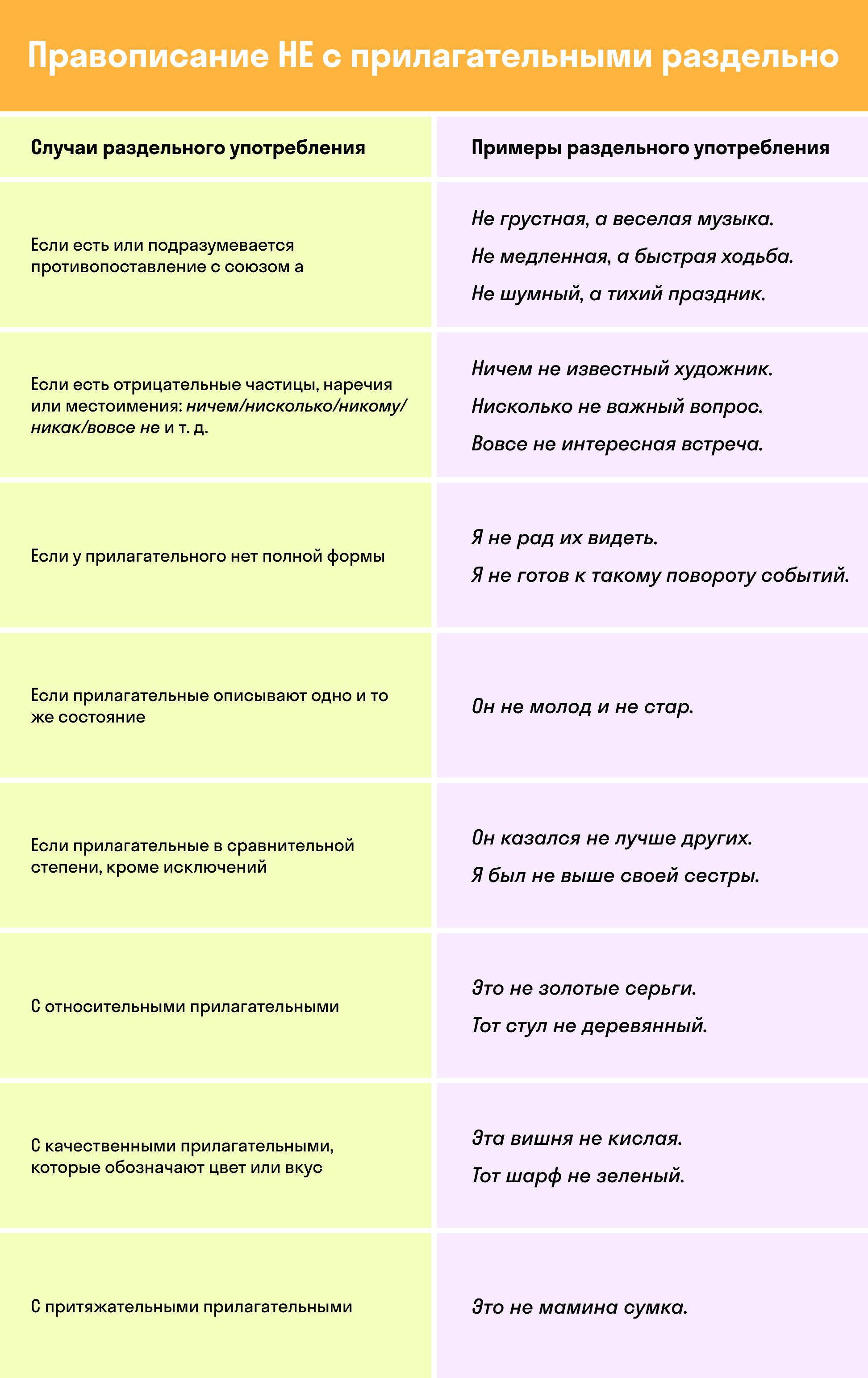 Как пишется не с прилагательными в этих случаях? Для самопроверки можно использовать таблицу правописания частицы не с прилагательными ниже.