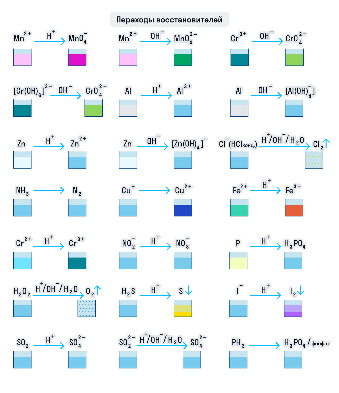 Для удобства мы собрали цвета переходов важнейших веществ-восстановителей в одном месте.