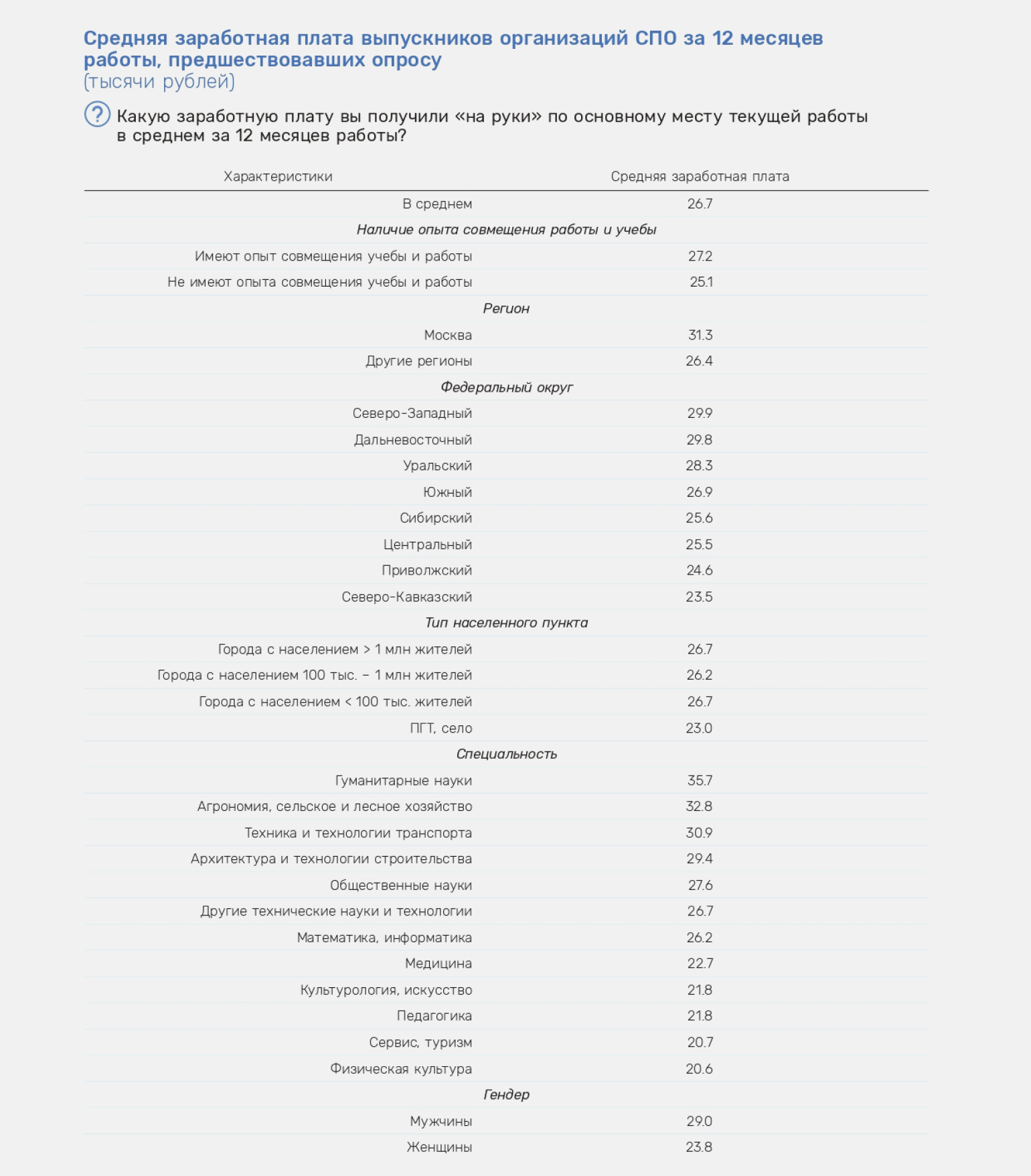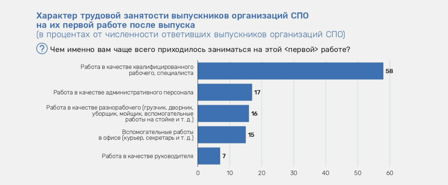 Большинство выпускников (69%) системы СПО трудоустраиваются по полученной специальности. Подчёркивается, что это значение тоже выше представленного Росстатом: официальные данные за 2019 год показали, что работа соответствует специальности лишь у 58% работников со средним профобразованием.