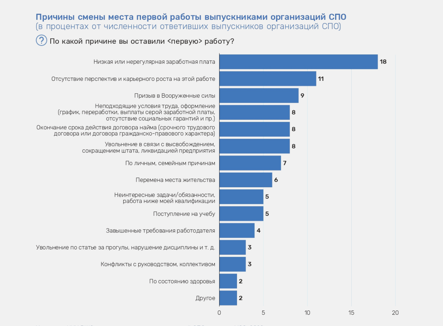 Авторы мониторинга отметили, что любым молодым сотрудникам свойственна частая смена работы, однако выпускники системы СПО к этому не так уж склонны — только у 40% респондентов текущее место работы не совпадает с первым. Частая смена работы тоже нехарактерна для тех, кто окончил колледж, а меняют работу чаще всего из-за низкой или нерегулярной зарплаты.