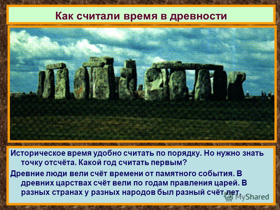 Историческое время удобно считать по порядку. Но нужно знать точку отсчёта. Какой год считать первым? Древние люди вели счёт времени от памятного события. В древних царствах счёт вели по годам правления царей. В разных странах у разных народов был разный счёт лет. Как считали время в древности