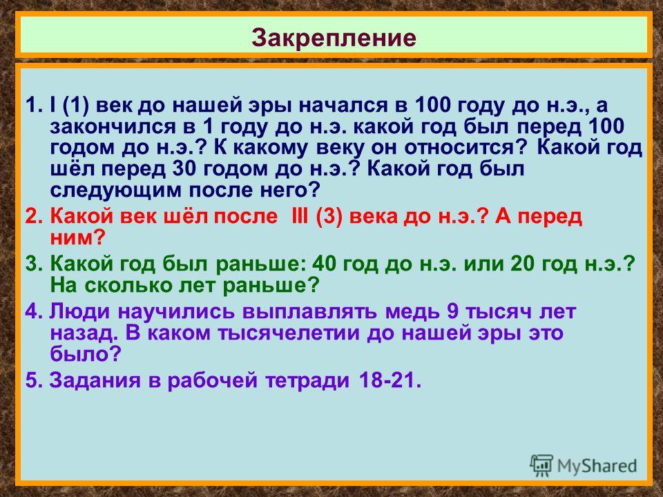 1. I (1) век до нашей эры начался в 100 году до н.э., а закончился в 1 году до н.э. какой год был перед 100 годом до н.э.? К какому веку он относится? Какой год шёл перед 30 годом до н.э.? Какой год был следующим после него? 2. Какой век шёл после III (3) века до н.э.? А перед ним? 3. Какой год был раньше: 40 год до н.э. или 20 год н.э.? На сколько лет раньше? 4. Люди научились выплавлять медь 9 тысяч лет назад. В каком тысячелетии до нашей эры это было? 5. Задания в рабочей тетради Закрепление