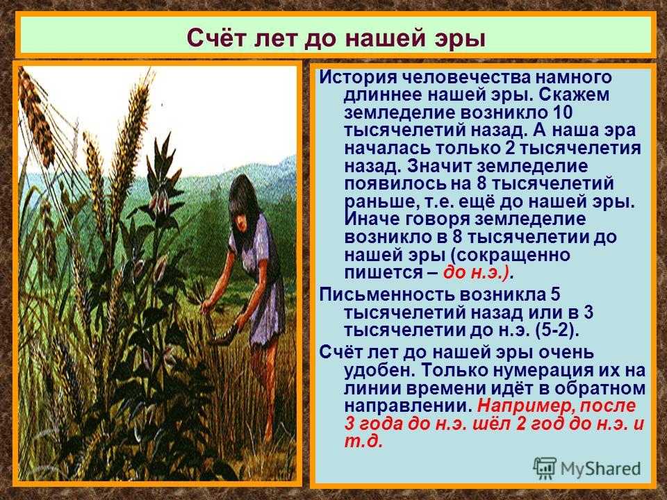 История человечества намного длиннее нашей эры. Скажем земледелие возникло 10 тысячелетий назад. А наша эра началась только 2 тысячелетия назад. Значит земледелие появилось на 8 тысячелетий раньше, т.е. ещё до нашей эры. Иначе говоря земледелие возникло в 8 тысячелетии до нашей эры (сокращенно пишется – до н.э.). Письменность возникла 5 тысячелетий назад или в 3 тысячелетии до н.э. (5-2). Счёт лет до нашей эры очень удобен. Только нумерация их на линии времени идёт в обратном направлении. Например, после 3 года до н.э. шёл 2 год до н.э. и т.д. Счёт лет до нашей эры