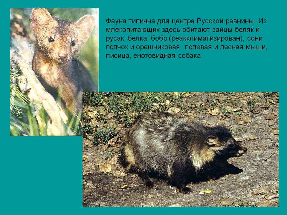 | Лесостепи | Окско-Донская и Тамбовская низменности | Береза, граб, осина, мятлик луговой, подмаренник настоящий | Белки, зайцы, косули, куницы, лесные сурки, хомяки, ящерицы, тетерева |