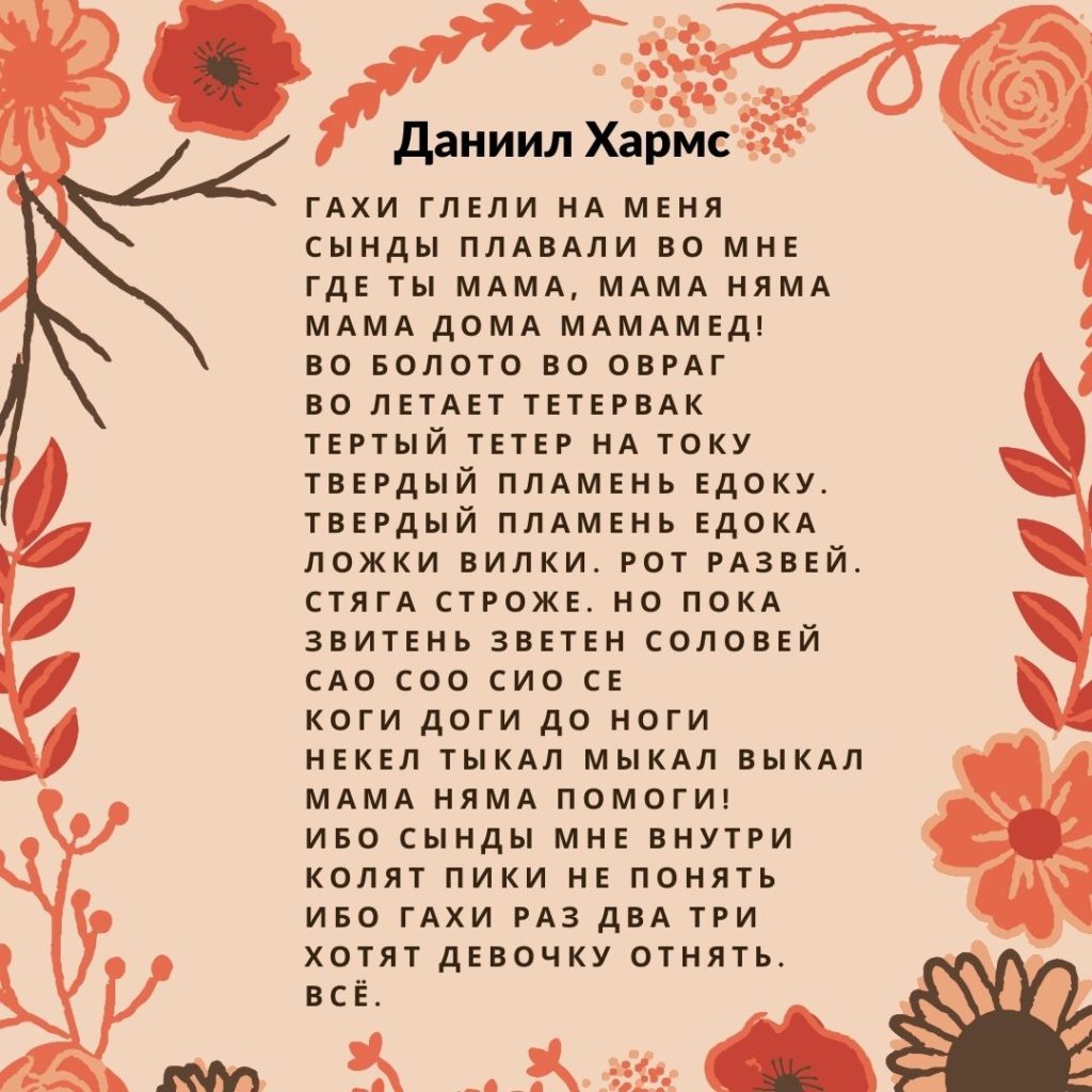 А вот шедевр Даниила Хармса. Называется «Мама Няма аманя». Попробуйте запомнить, когда ничегошеньки не понятно! Можно только догадываться, что имел в виду автор. Да и догадки будут у каждого свои…