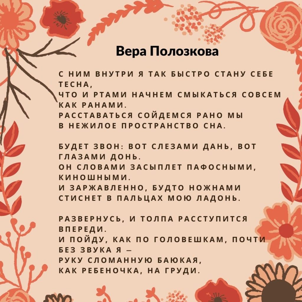 Не оставим в стороне и современную поэзию. Возьмем стихотворение «С ним внутри» талантливой молодой поэтессы Веры Полозковой.