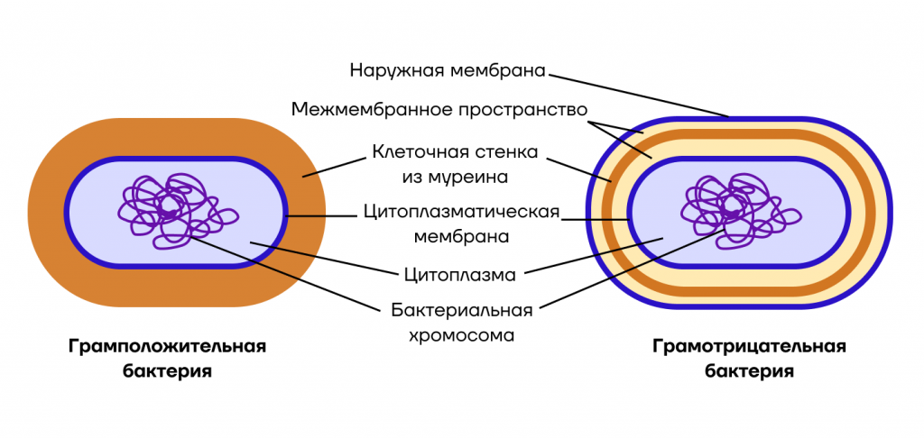 Строение грамположительной и грамотрицательной бактерий