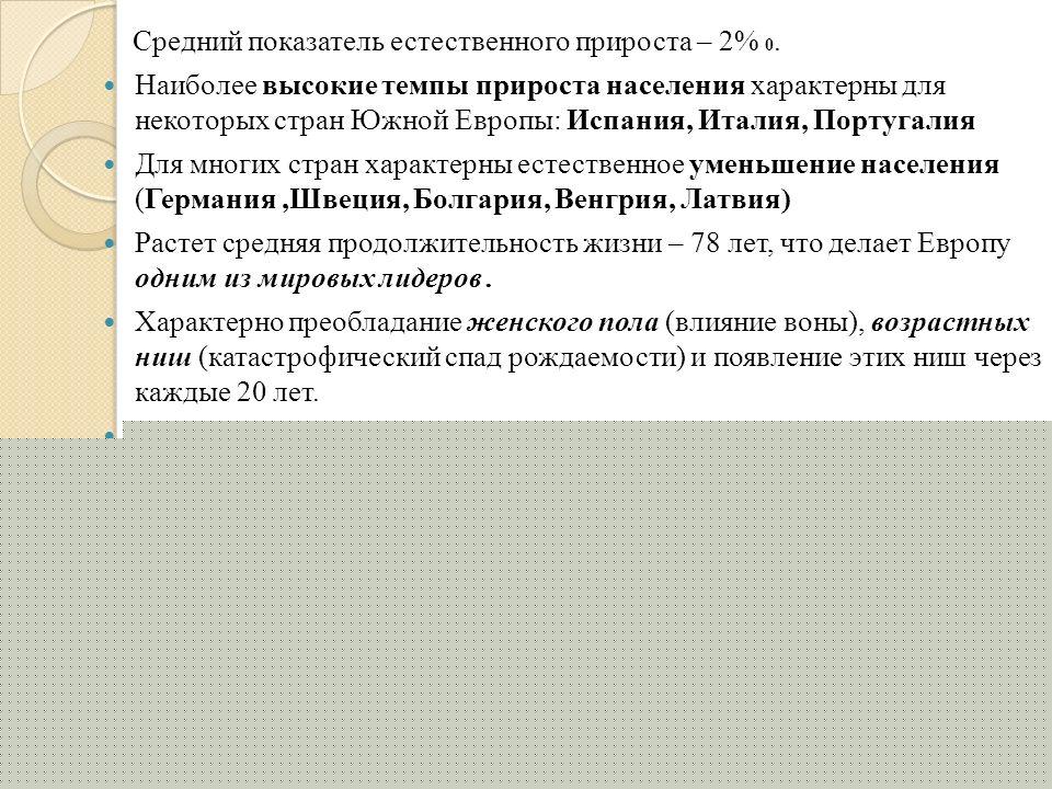 Средний показатель естественного прироста – 2% 0. Наиболее высокие темпы прироста населения характерны для некоторых стран Южной Европы: Испания, Италия, Португалия Для многих стран характерны естественное уменьшение населения (Германия,Швеция, Болгария, Венгрия, Латвия) Растет средняя продолжительность жизни – 78 лет, что делает Европу одним из мировых лидеров. Характерно преобладание женского пола (влияние воны), возрастных ниш (катастрофический спад рождаемости) и появление этих ниш через каждые 20 лет. Национальный состав – 62 национальности. Религия – Северная Европа –протенстатизм. Восточный – православный регион, Южная – католицизм. Европа – сами урбанизированный регион в мире. Средний уровень урбанизации – 80%. в Европе 35 городов миллионеров, крупнейшие из них – Лондон и Париж, население которых достигает 10 млн человек. Агломераций — 400