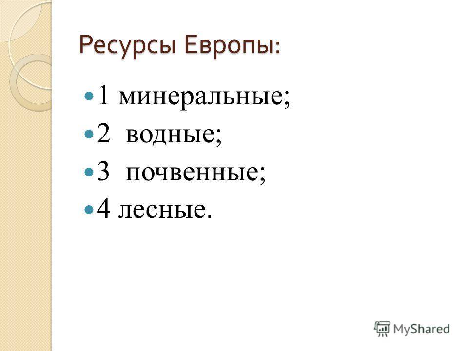 Ресурсы Европы : 1 минеральные; 2 водные; 3 почвенные; 4 лесные.
