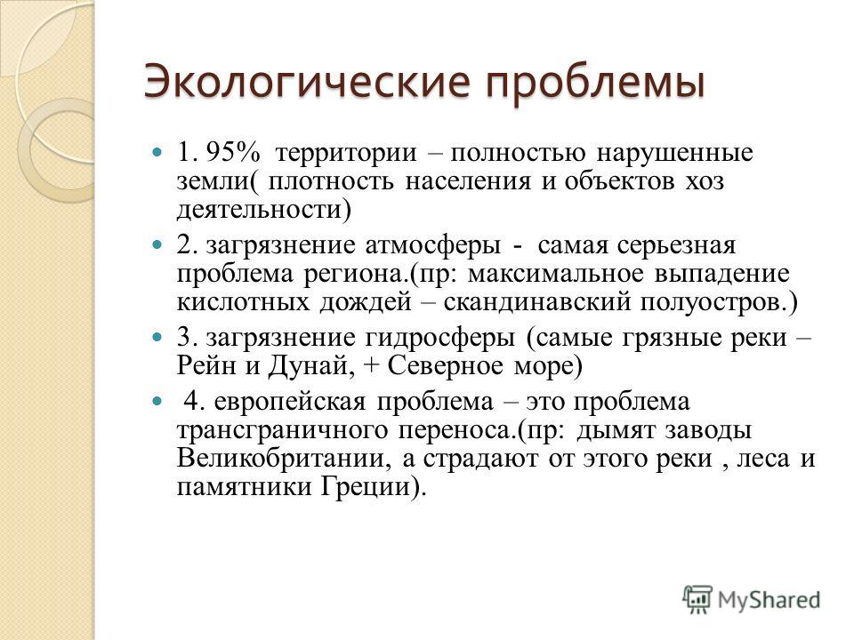 Экологические проблемы 1. 95% территории – полностью нарушенные земли( плотность населения и объектов хоз деятельности) 2. загрязнение атмосферы — самая серьезная проблема региона.(пр: максимальное выпадение кислотных дождей – скандинавский полуостров.) 3. загрязнение гидросферы (самые грязные реки – Рейн и Дунай, + Северное море) 4. европейская проблема – это проблема трансграничного переноса.(пр: дымят заводы Великобритании, а страдают от этого реки, леса и памятники Греции).