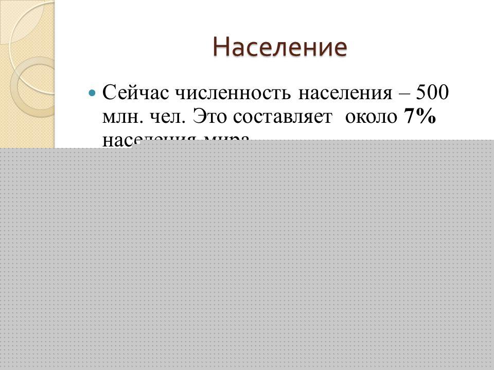 Население Сейчас численность населения – 500 млн. чел. Это составляет около 7% населения мира. В конце 19 в доля Европы в мировом населении составляла почти 18 %. Снижение доли населения региона связано не с сокращением населения европейского региона, а с увеличением численности населения других регионов.