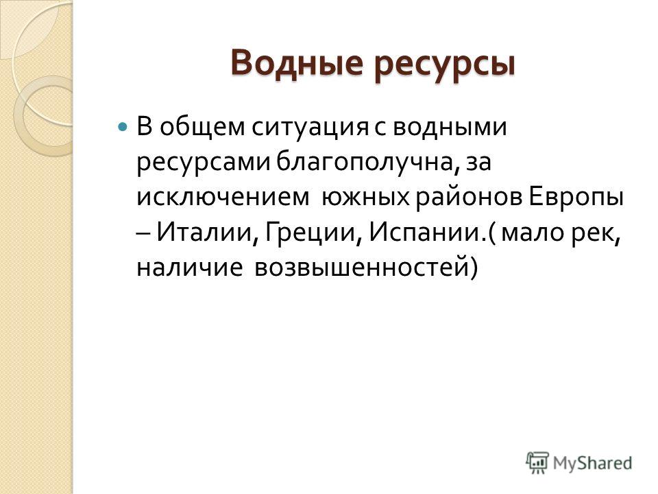 Водные ресурсы В общем ситуация с водными ресурсами благополучна, за исключением южных районов Европы – Италии, Греции, Испании.( мало рек, наличие возвышенностей )