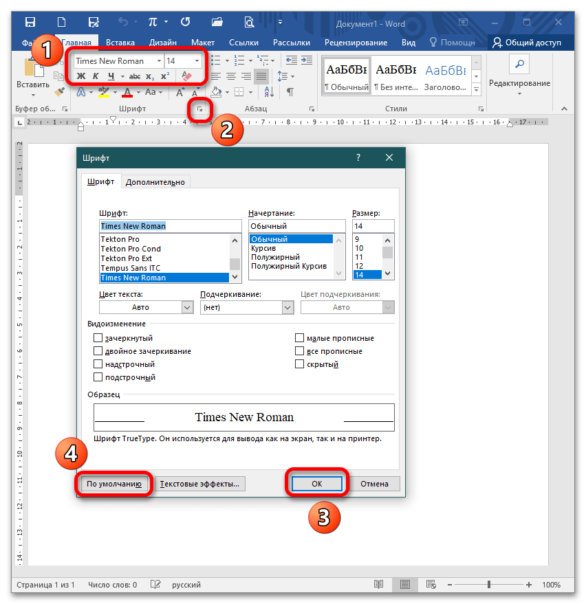 Для настройки шрифтов либо откройте диалоговое окно, либо воспользуйтесь панелью инструментов. В диалоговом окне в предлагаемых разделах установите необходимые параметры и кликните «ОК». Если планируете придерживаться указанных параметров и в дальнейшем, нажмите кнопку «По умолчанию». Это позволит не вводить каждый раз значения, а использовать установленные настройки в качестве шаблона. К слову, при вызове окна «Шрифт» настройка параметров доступна в расширенном режиме.