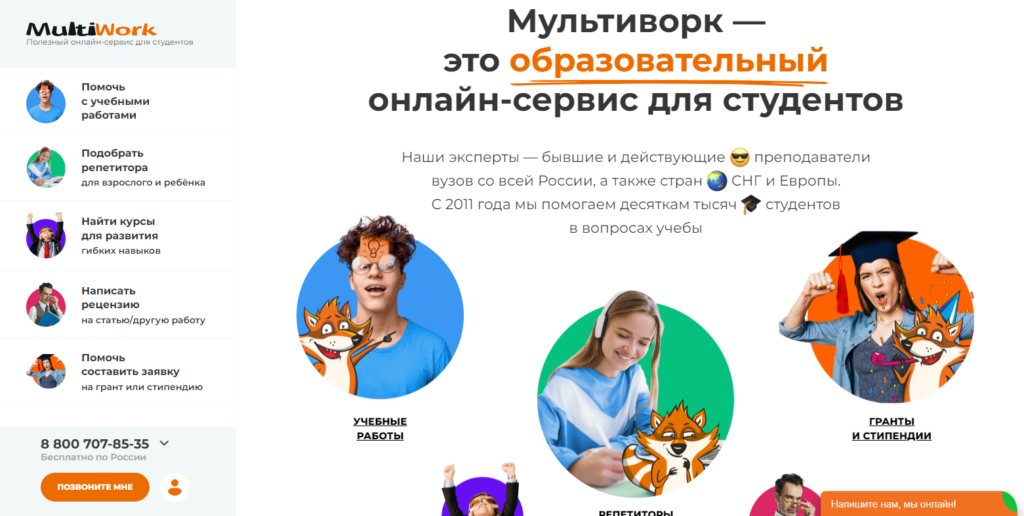 Помимо получения помощи в написании разных работ на сайте можно пройти образовательные курсы, подобрать репетитора и получить консультацию по оформлению гранта на стипендию. Платформа надежная, работает более 9 лет, в базе числятся более 500 тыс. экспертов. Есть круглосуточная поддержка и бесплатная горячая линия.